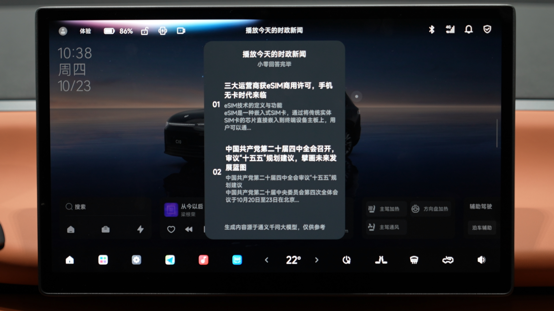 该产品基于阿里云百炼大模型平台,整合了通义千问与DeepSeek多项模型能力,每天调用数十万条权威新闻作为训练语料,覆盖时政、财经、科技、体育、文化等12大主流频道。用户无需下载App或连接手机,仅通过一句语音指令,就能在零跑C10、C11、C16、B10等车型的智能座舱中,实现“问热点、听摘要、看图文、聊观点”的全链路互动体验。