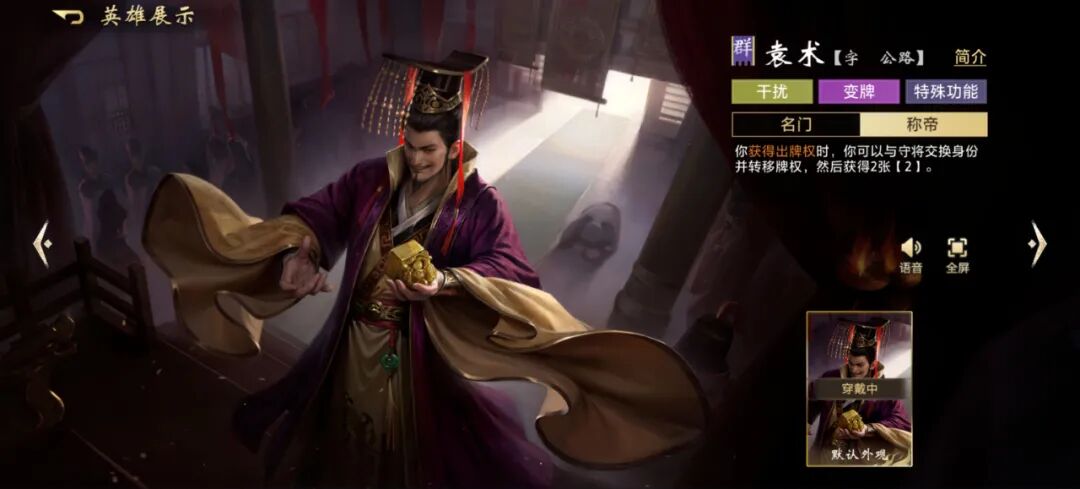 甚至游戏中不少英雄还有特殊功能,比如袁术的“称帝”技能,就可以在获得出牌权时,与守将交换身份便转移牌权,然后获得两张“2”,这种转变身份的设计,恰恰是《三国:百将牌》把玩法逻辑集中在英雄设计上的最佳诠释,博弈的重点,也在英雄之间的对抗。